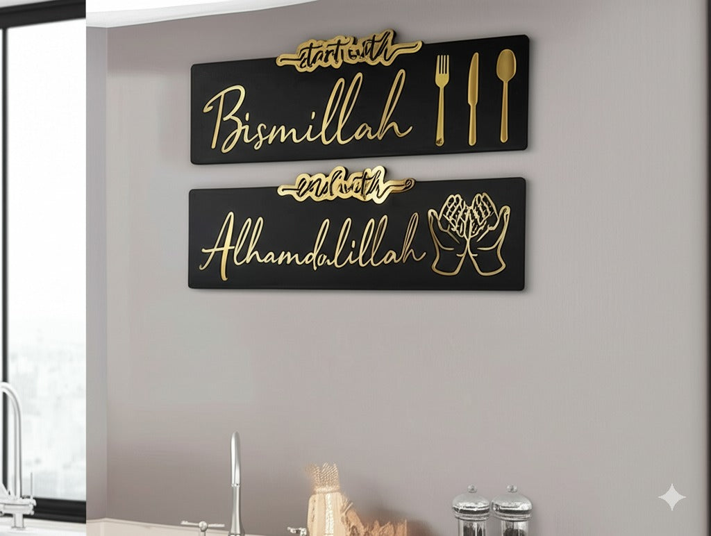 2-Piece Islamic Wall Art – Bismillah & Alhamdulillah | Gold Acrylic on Wood
